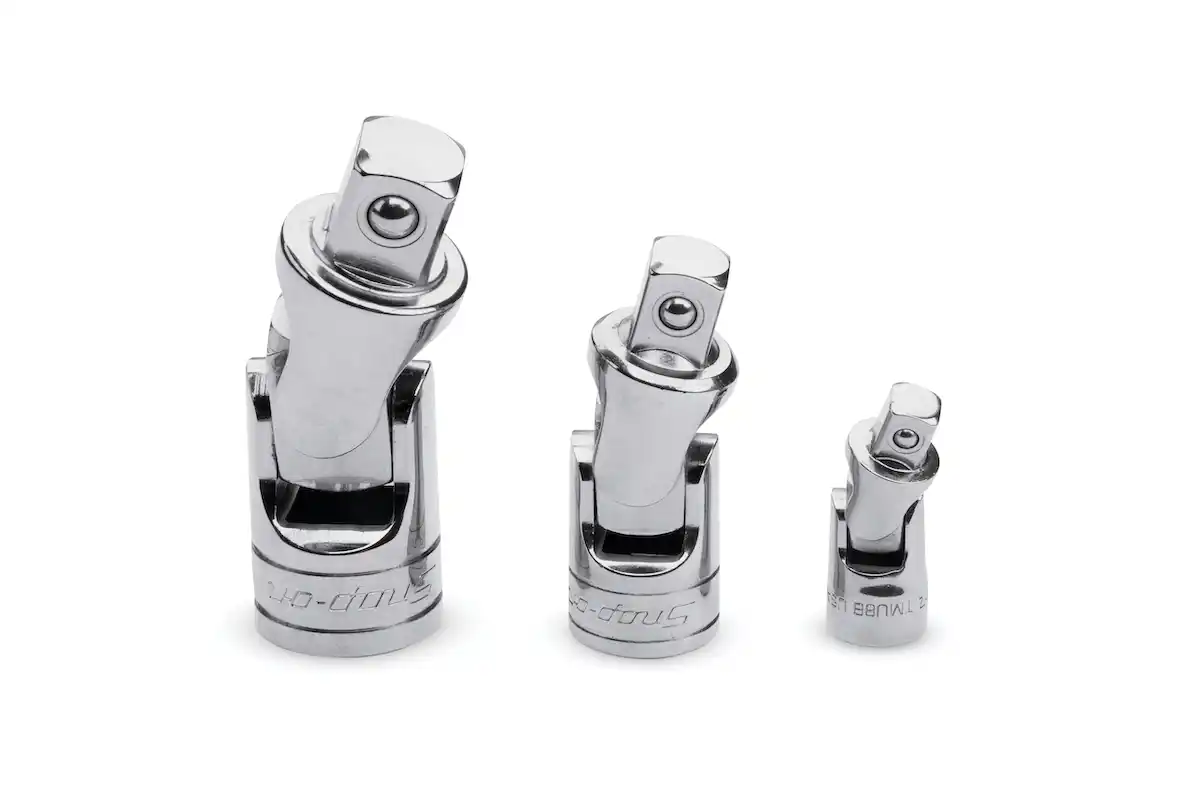 De complete set Snap-on 1/4 kniestukken bestaat uit 3 stuks met een 1/4, 3/8 en 1/2 aandrijving. De set wordt geleverd inclusief 1/4 universele koppeling, 3/8 aandrijving kruiskoppeling en een 1/2 aandrijving kruiskoppeling. De set wordt geleverd in een handige opbergrtray.