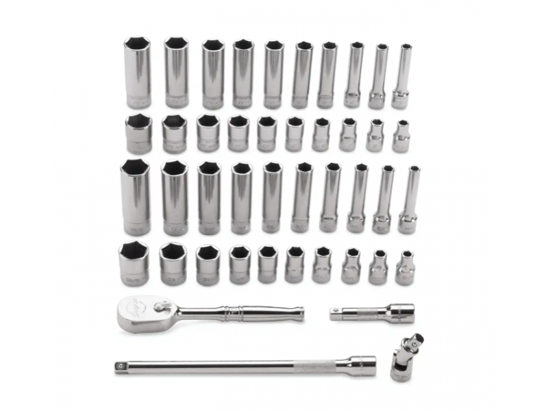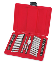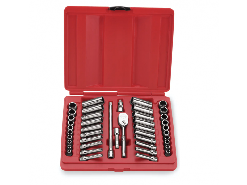 • Inclusief (40) SAE/metrische ondiepe en diepe doppen, 2" verlengstuk, 6" verlengstuk, kruiskoppeling en T72 ratel in een plastic opbergkoffertje