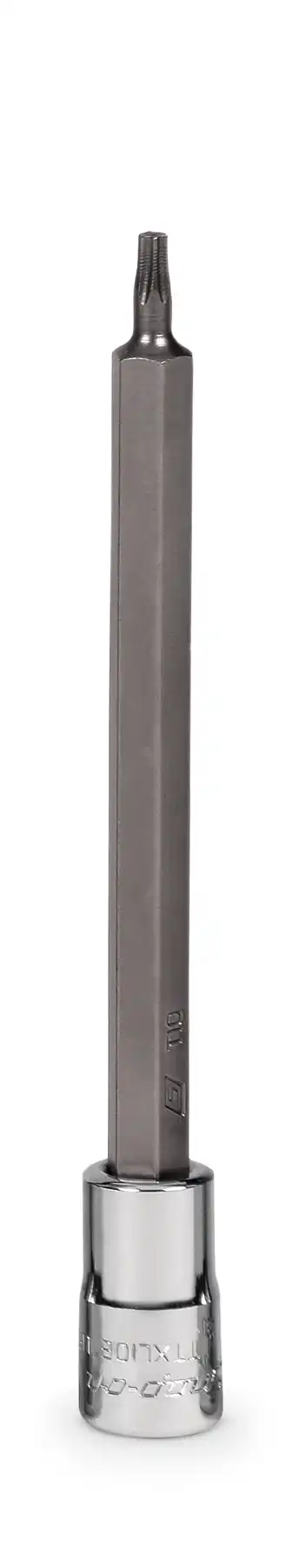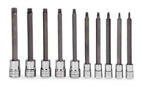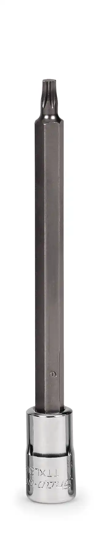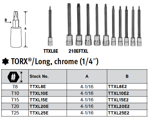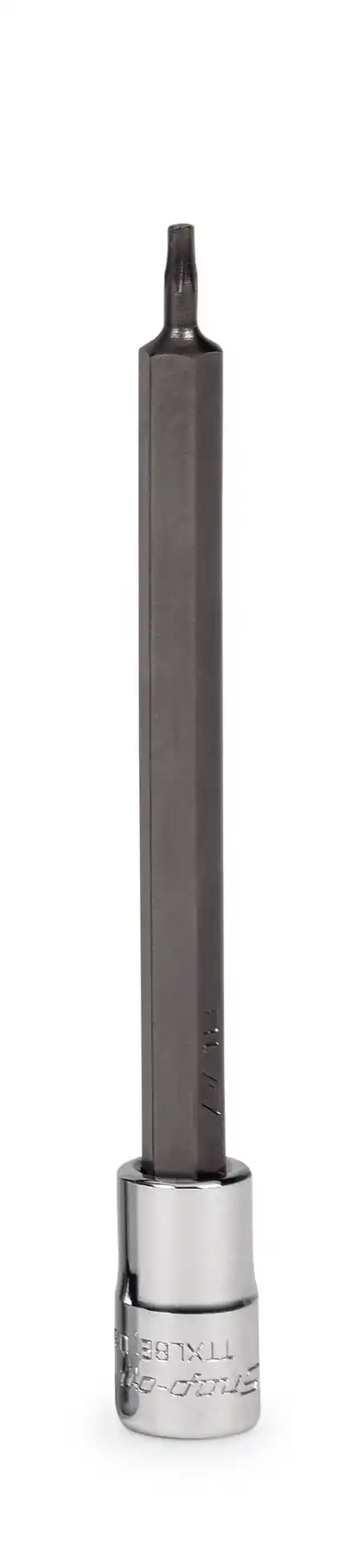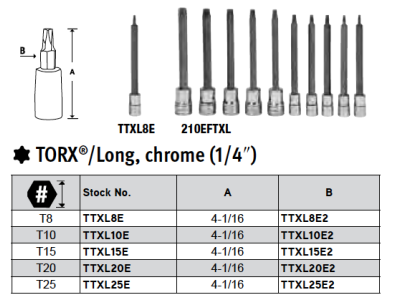 De Snap-on 1/4 inch Torx lang set 210EFTXL bevat 1/4 inch aandrijving TTXL8E-TTXL25E (T8-T25) en 3/8 inch aandrijving FTXL27E-FTXL50E (T27-T50). De set wordt geleverd in een opbergtray.