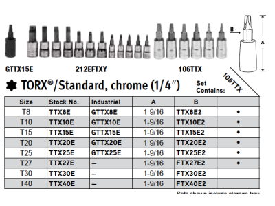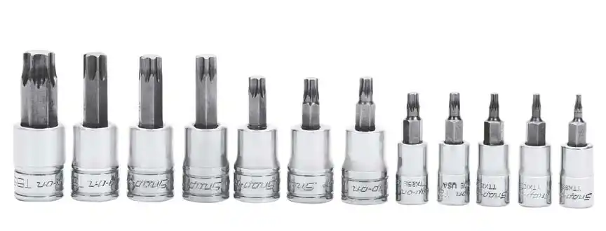De Snap-on 1/4 inch torx doppen set bestaat uit 5 1/4 inch torx drivers (T8-T25), 6 3/8 inch torx drivers (T27-T55) en 1 3/8 inch driver FTX47E GM®-stijl driver (T47).