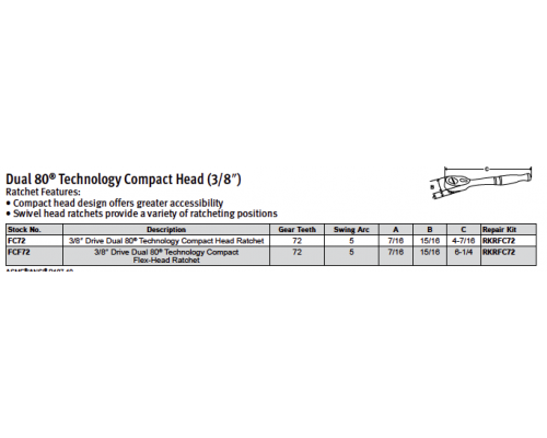 De 3/8 Dual 80® Technology ratels met compacte kop zijn uitgerust met een 72-tands mechanisme dat zorgt voor een 15% kleinere ratelboog. Dit betekent dat je sneller kunt werken in krappe ruimtes, omdat je minder beweging nodig hebt om de volgende tand te grijpen. Dit is cruciaal wanneer je werkt in motorruimtes, onder dashboards of in andere beperkte werkgebieden.