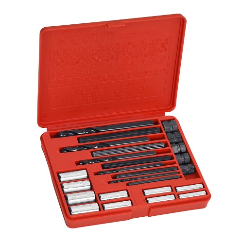 - Voor het uitdraaien van afgebroken tapeinden en bouten van 6 t/m 13 mm zonder uitzetting van het materiaal Bevat 5x rechtsdraaiende boortjes (1/8, 3/16, 1/4, 5/16 en 11/32Ò), 10x massieve boorgeleiders (9/32 Ð 9/16Ó D) en 5x rechte extractors, plus 5x zeskantkragen (#1 Ð 5) in een opbergkoffer Inclusief opbergkoffer