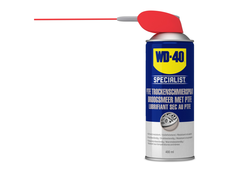 De WD-40 droogsmeer met PTFE is een spray met PTFE wat zorgt voor een betere smering, ook bij hoge temperaturen en onder hoge druk. De achterblijvende droge laag trekt geen stof, vuil of olie aan. De wrijving verminderende formule maakt het perfect voor gebruik op mechanismen die intensief worden gebruikt en die bescherming nodig hebben tegen dagelijkse slijtage, zoals deur- en raamrails, kettingen en rollers, elektrische gereedschap, boren en slotmechanismen.